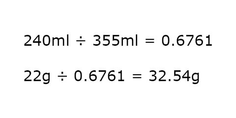 You say “But wait Tim, you’re completely wrong. Tropicana has only 22 grams of sugar per serving while Pepsi has a whopping 40 grams”. Even if I assumed you were a master at pouring exactly one serving of juice, which you are not, if you look closely at the labels you can see that 1 serving of Pepsi is 355 millilitres while one serving of Tropicana is only 240 millilitres. We need to do some math to be able to compare the two. Since millilitres is volume, and volume is comparable between two different substances (unlike mass), all we need to do is calculate what percentage the volume of the Tropicana serving is of the volume of the Pepsi serving and divide the grams of sugar in the Tropicana by that amount. While this may seem complicated, I’ve done the heavy lifting and got you covered.